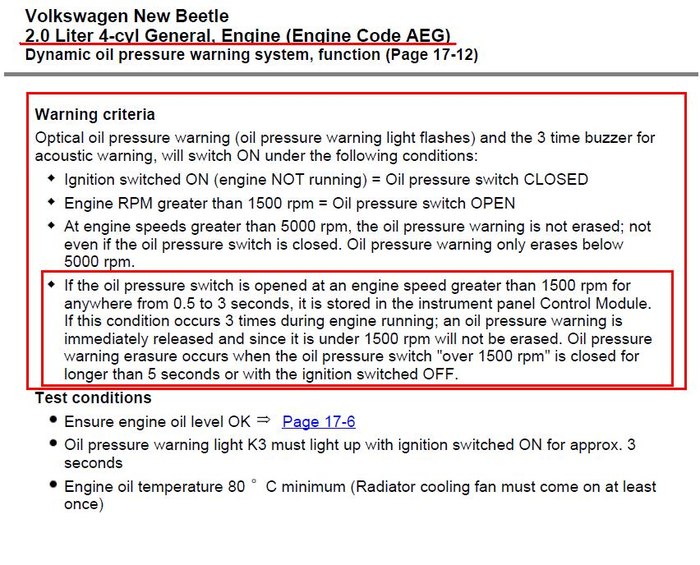 又看到一个比较接近老宝的, 来出新甲壳虫.报警系统基本跟上面相同, 还增加了点.大概如下:1. 如果车速超过1500转时,机油压力开关打开0.5~3秒, 她就将信息存在面板记忆中.2. 如果上面情况连续出现3次, 机油警告灯就立即着, 这时就算转速低于1500转也会报警.3. 直到下次机油压力开关在超过1500转时关闭5秒才会停止报警.4. 关掉发动机(熄火)也会停止报警. 下次着车重复上面检查. 2015-03-09增加点资料:其实这个跟亮红灯没什么关系,着个亮黄灯, 就是说缺少机油. 听说只有8T才有这个机油温度传感器. 为什么我一直...