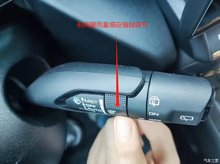 C:把拨杆拨到INT档,智能间歇刮水开始。根据雨量的大小自动决定刮水的频率。要配合拨杆上的雨量感应调节旋钮使用。往上转动,雨量感应强,自动刮水相应加快。反之,感应雨量弱,刮水慢。