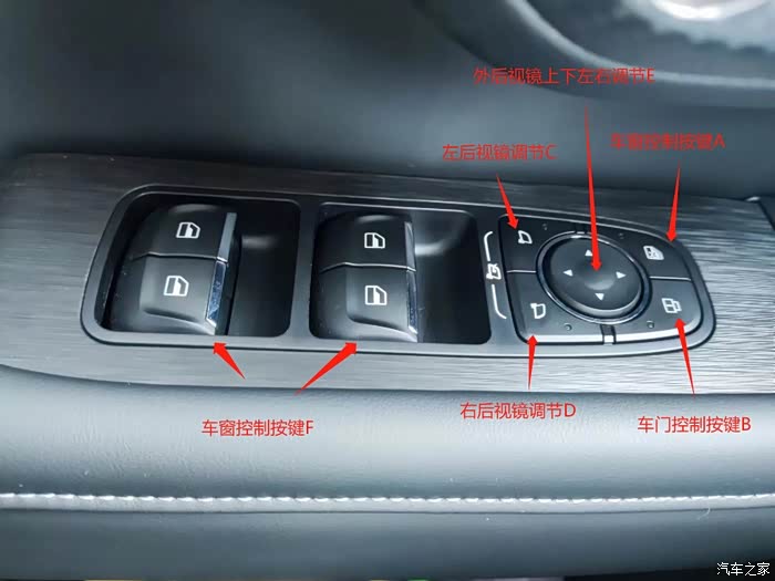 D:右后视镜调节键。按下亮红灯,可以开始调节右后视镜。