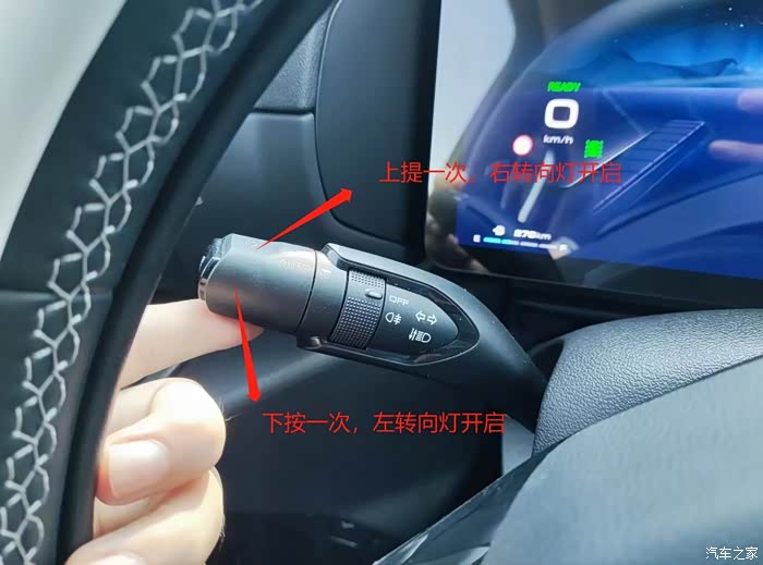 往下按一次灯光拨杆,开启左转向灯,往上提一次,开启右转向灯。