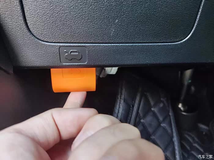 3:前舱盖开启按钮。位于主驾驶座椅前面的最底部。往上抬,前舱盖解锁。这个按键很隐蔽。它上面有一个前舱盖开启车图。手顺着车图往下可以摸到此按钮。