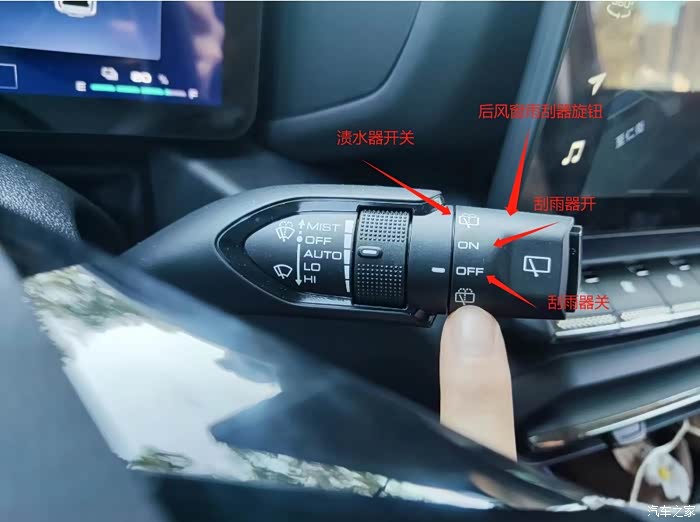 旋转至ON,后雨刮器开启。OFF关闭。旋转至后风窗洗涤图标,喷洗涤液清洗后风窗