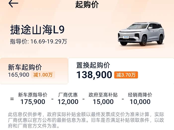 现捷途山海L9裸车指导价直接优惠10000元,但是可以根据车型再砍1-2千块,千万不要手软!砍价和补贴要两手抓,两手都要硬!还有就是厂家给出了置换补贴12000元,这样已经降价22000元!