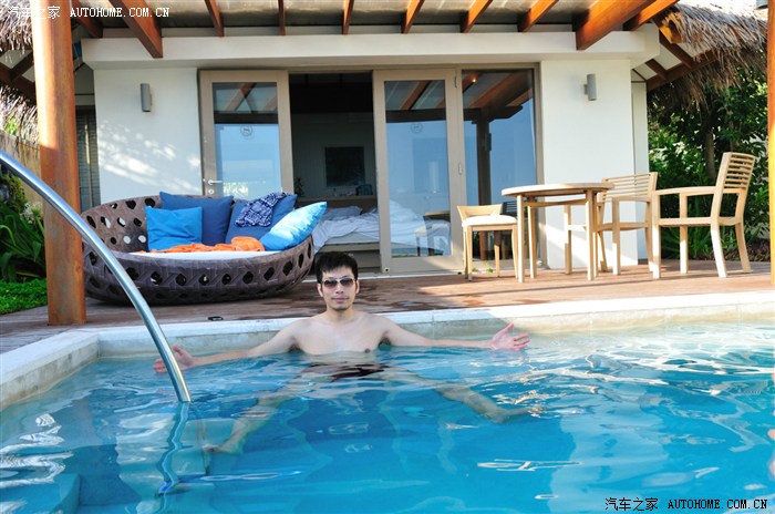 每天早上醒来第一件事就是推开门先跳进这大泳池里泡一阵再出来,每天晚上最惬意的就是两个人舒服的躺在泳池里,喝着红酒,听着海浪,聊着情话,看着星星~人生最享受不过如此(媳妇穿着泳衣呢,各位可别想歪了,呵呵)