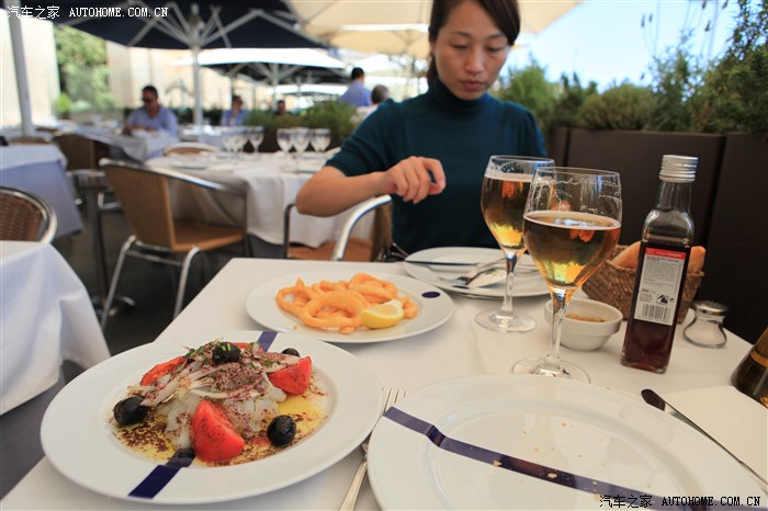 酒杯旁边那瓶东西我们一开始一直在研究是啥玩意儿,因为桌上已经有一瓶橄榄油了,不见得放两瓶橄榄油吧,虽然橄榄油是当地特产,但也不至于他们那么爱喝油吧。得,还是自己亲自嚐一下见分晓吧。倒了点出来拿鱿鱼卷蘸了一下放嘴里,敢情是辣酱油,上海人的最爱啊。