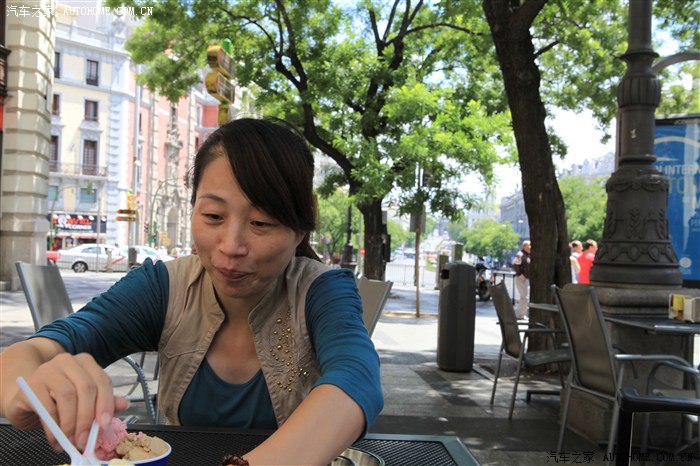 到了马德里搭地铁出站后找警察问去我们旅馆的路,给我们指明方向后顺着GRAN VIA大道一路走过来,期间还问了两个老头一个美女(美女太漂亮了,知道问她肯定没有答案,但还是想去搭讪一下),结果都不知道我们的旅馆在哪里,老婆看到路边有吃冰激凌的就提议先吃再说,于是把行李往旁边一放先享受再说。