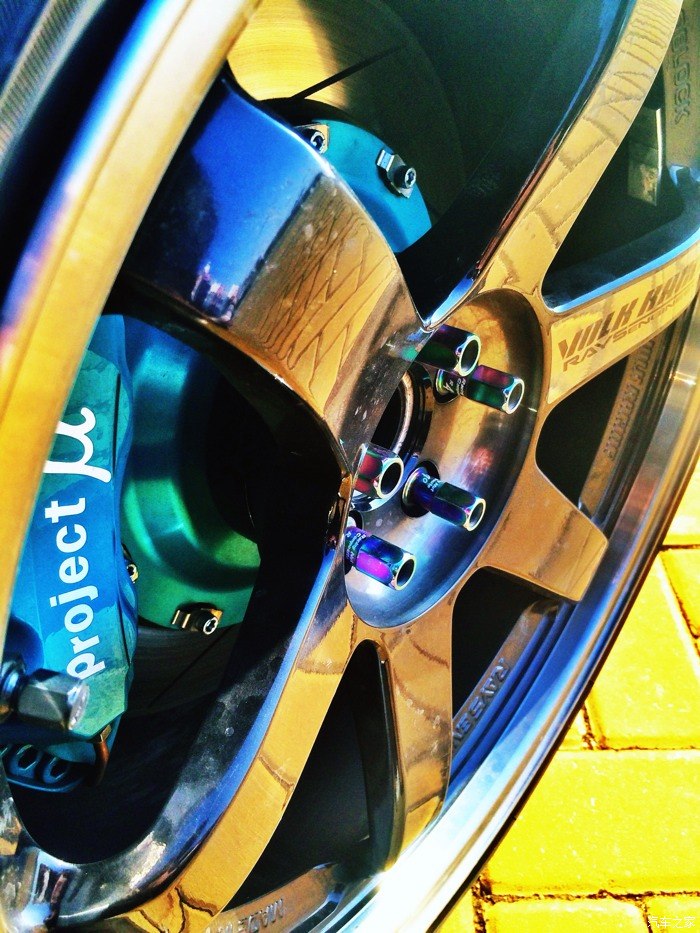 TE37sl,老掉牙的经典,配色是近年新增的pressed double black亮黑色,刹车是日系低调骚气有内涵的project μ,在这个brembo,AP,endless满街跑的日子里给你眼前一亮的小清新的味道。前六后二,限量竞技款,配50~800度的刹车皮,刹车的力道来的很直接,和project μ市面上常见的前四后二套件的体验完全不可同日而语,马力上了400+也可以安心的驾驭。关键是那一抹亮骚的绿色让我第一次看就迷上了它,后来很多人都推荐我上endless系列,还是坚持了自己的初衷。一句话,千金难买我喜欢。