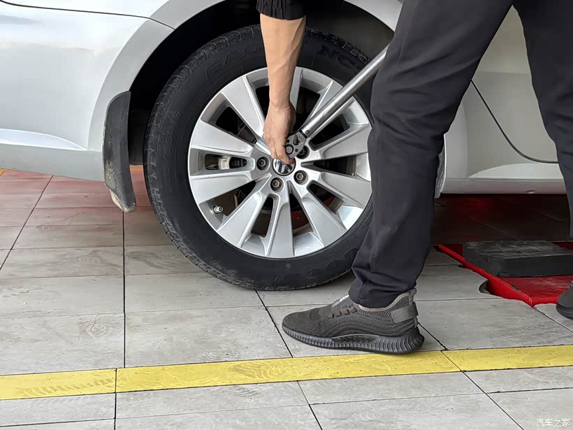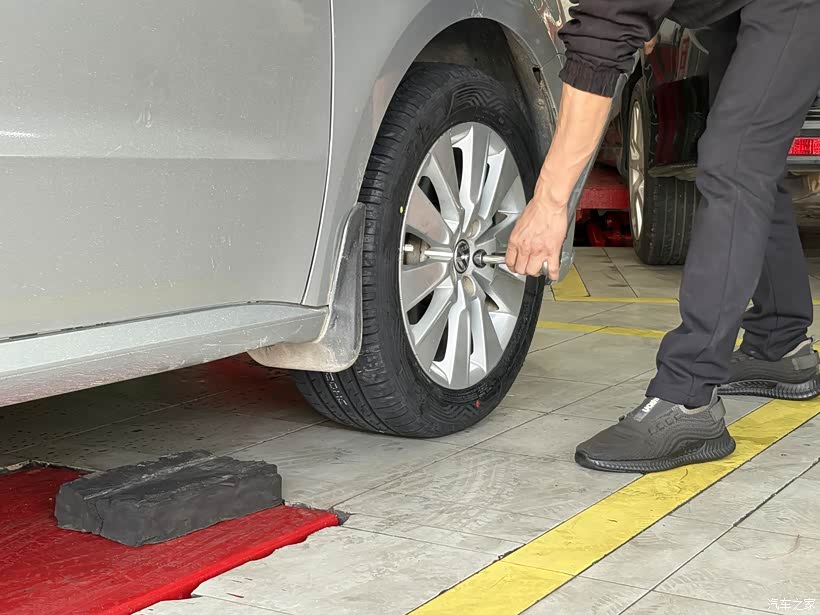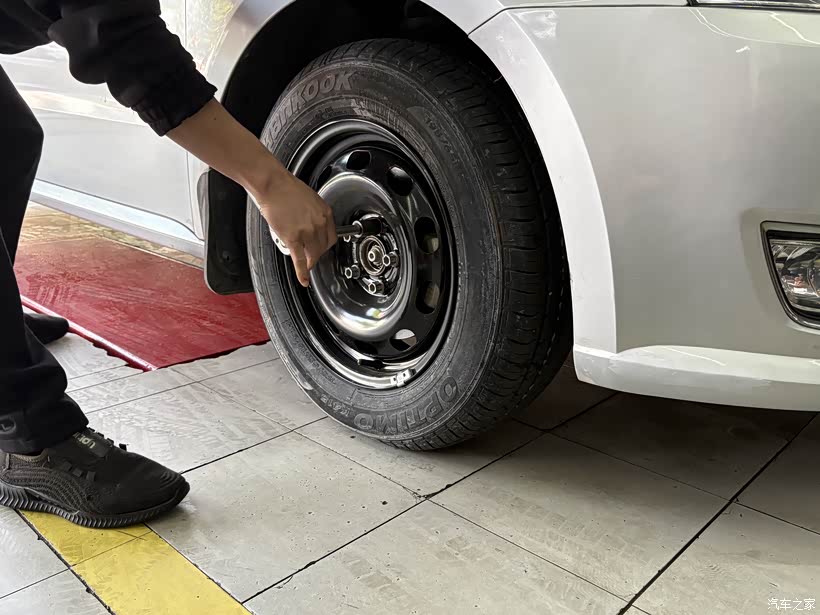 现在是在拆左前轮,先松开螺丝,左前轮要换到右后轮位置。