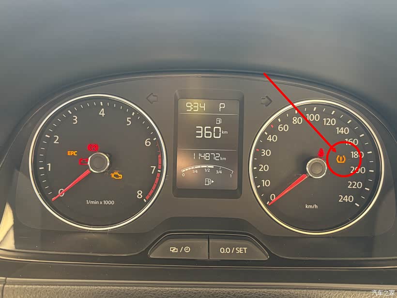 换好备胎后,因为备胎尺寸与其他三个轮胎不同,行驶了一段距离之后,仪表盘上的胎压报警灯亮起,从上图中箭头所指的故障灯。