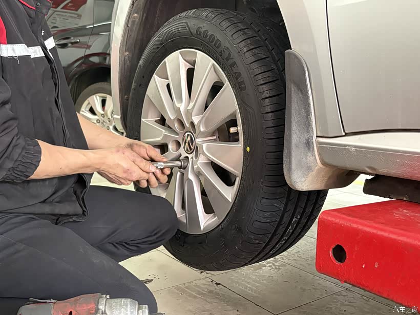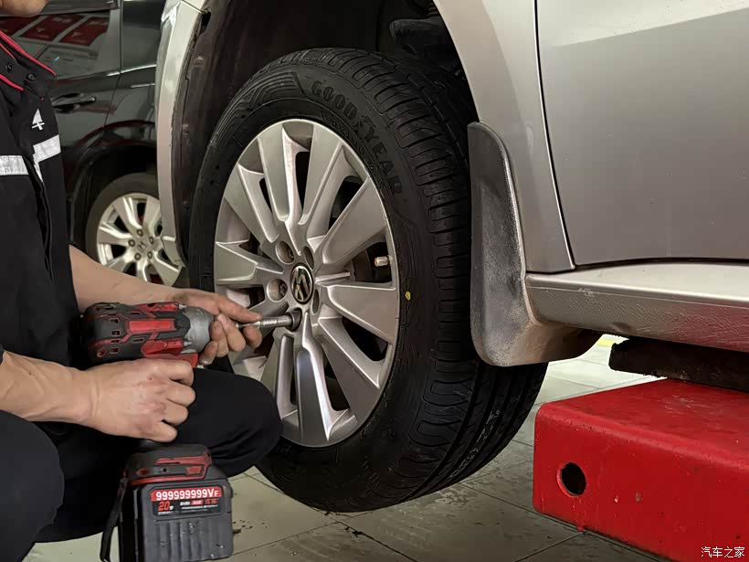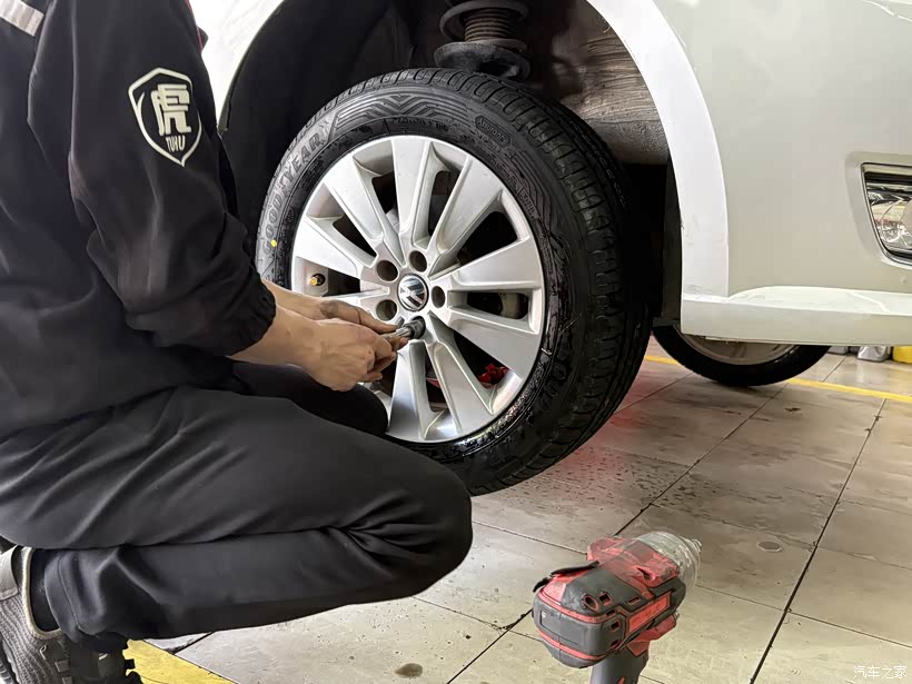 轮胎装好后,将车子降下来,再用大扳手逐个确认螺丝都有拧紧。