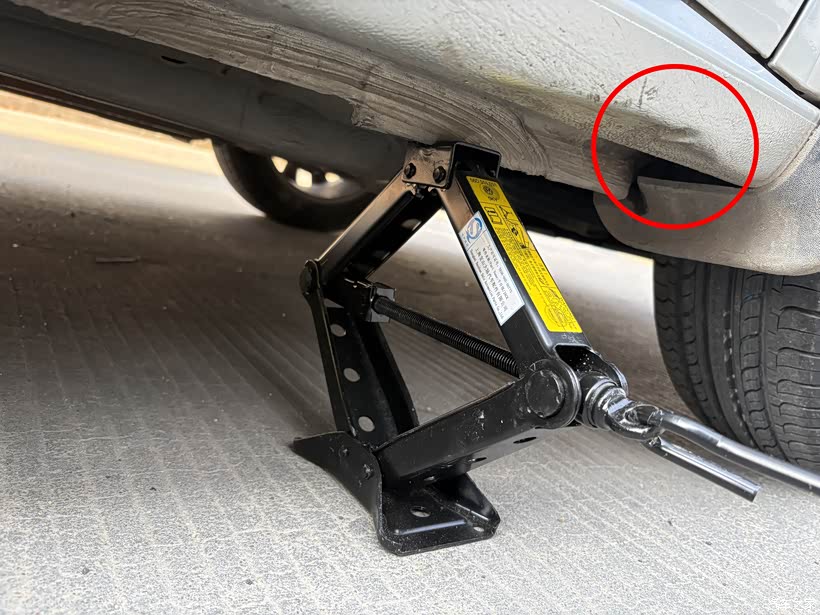 将千斤顶放好,顶住车身下方的横梁后,开始摇动千斤顶,我以为摇起来会很吃力的,结果是很轻松,不停转动螺杆,很快就把车子摇起来了,瞬间就打消了我之前对于这个单薄的千斤顶的质疑。