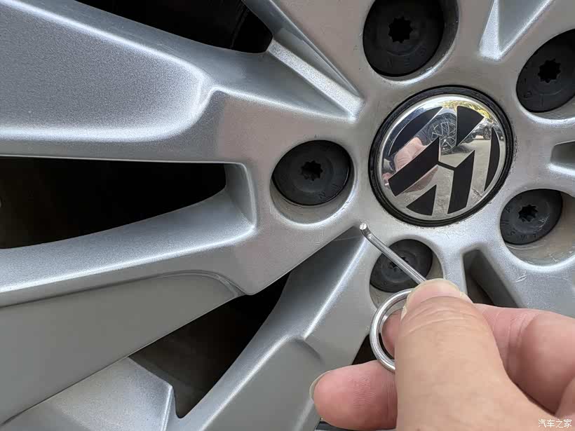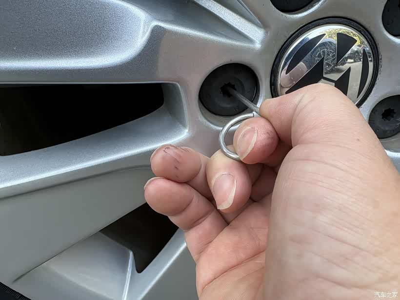 从后备箱内取出这个小钩针,这个钩针是取轮毂固定螺丝位置的螺丝帽用的,如上图,将钩针伸进去,然后一拉就可以取下螺丝帽了。
