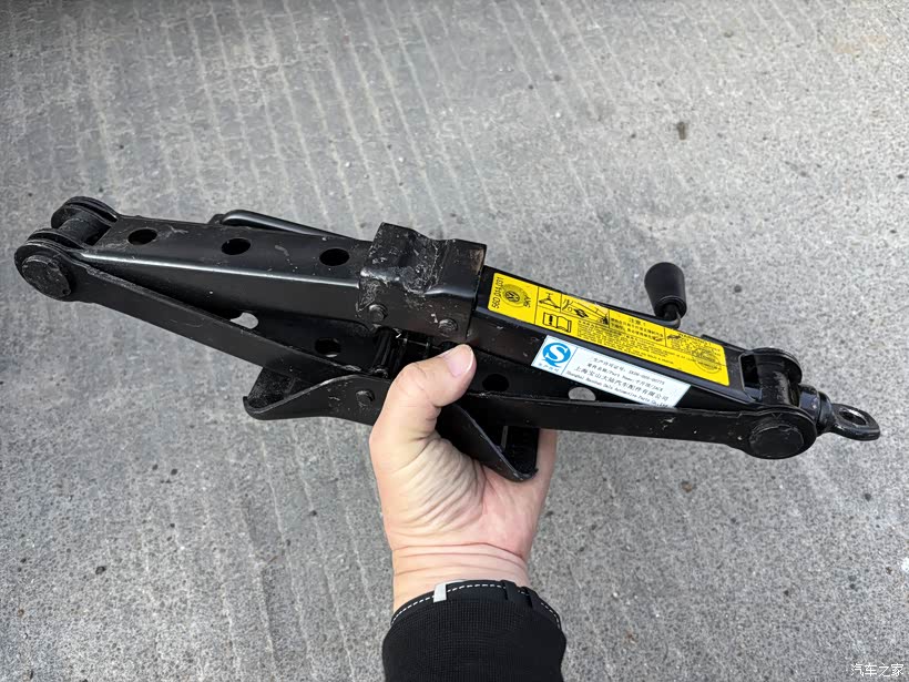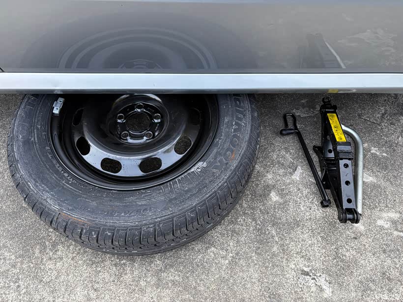 从后备箱内拿出备胎和千斤顶,当这个千斤顶拿在手上的时候,份量并不重,感觉轻飘飘的,我都怀疑这个单薄的千斤顶能不能顶起1吨多重的车身。