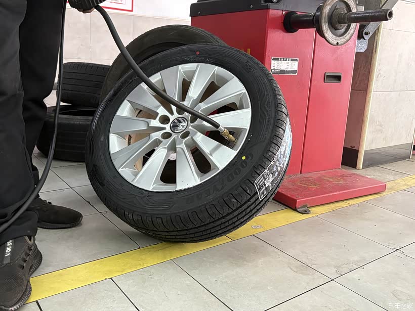 给换好的两个新轮胎先充满气,胎压打到2.5。