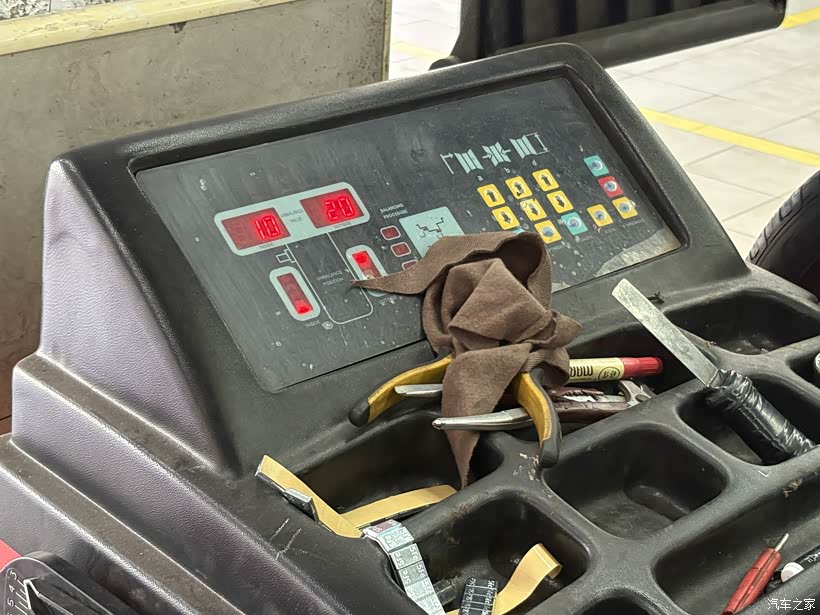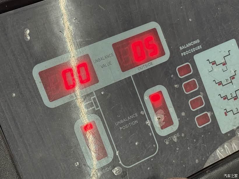 在看师傅操作的同时,我请教了一下动平衡的作用和标准,师傅告知,如果不做动平衡,当轮胎的动平衡不合格时,车子在行驶过程中会出现方向盘抖动、跑偏、吃胎等问题,在调校过程中,仪器上的两个数字小于05就是合格的。可以看到上图两个数字一个代表轮胎内侧、一个代表外侧。这个轮胎调试几次之后,数字来到了00、05,师傅说这样就合格了。