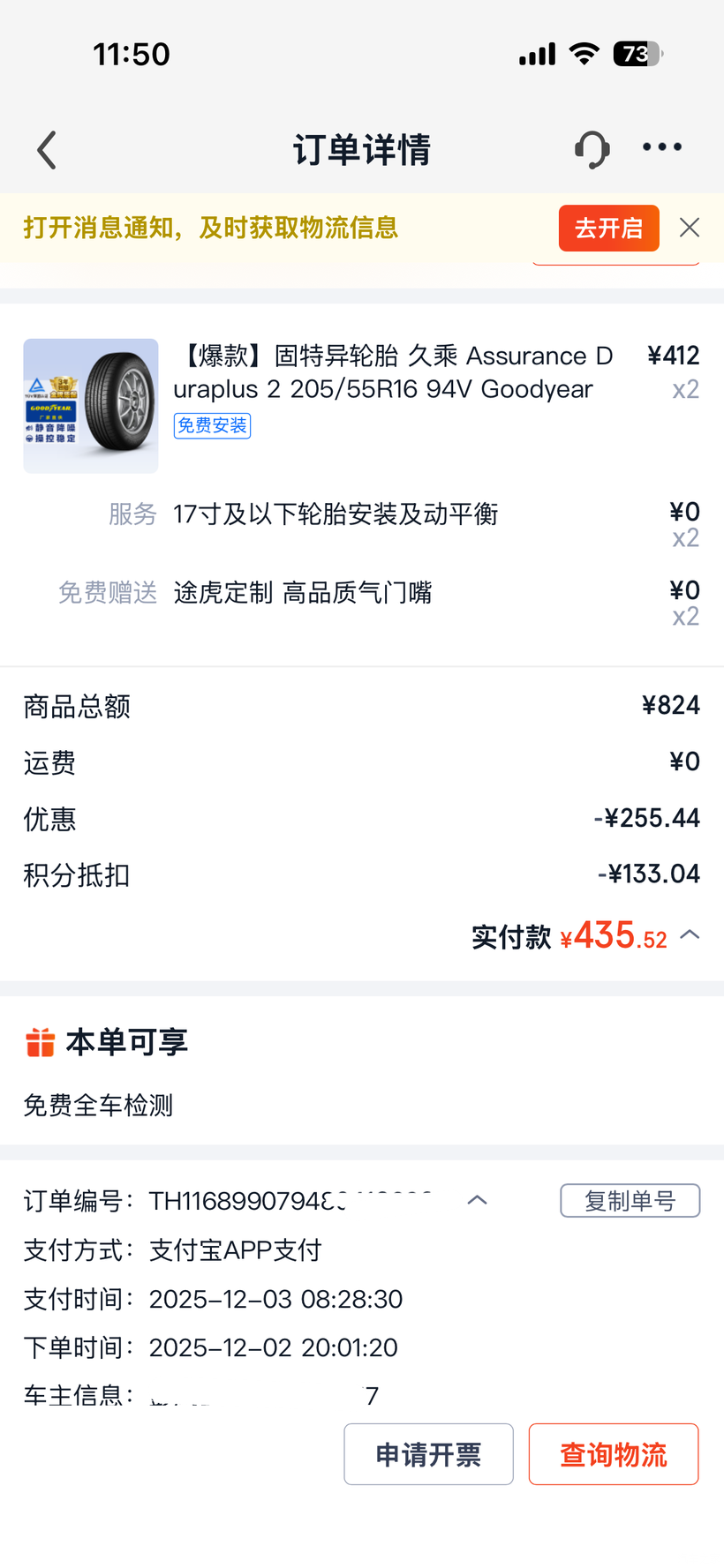 因为之前的两个前轮是三年前买的,考虑到这次爆胎的是右前轮,担心换一条新轮胎上去,前面两个轮胎的磨损程度不一样,思来想去后,决定换两条轮胎,回来后在网上下了两条轮胎,刚好赶上做活动,优惠力度还挺大的。