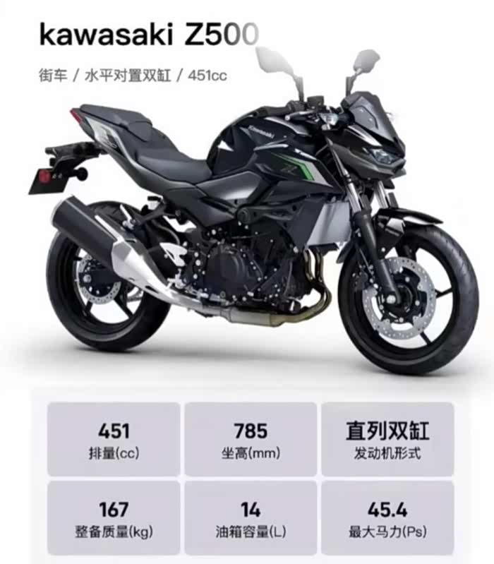 首先从这台Z500的整车配置与价格来分析它的优劣,特别是Z500采用的依旧是那台双缸水冷引擎,实际排量为451cc,对比了Z400这台车之后,Z500的排量也变大,从而让它拥有更强动力输出,应付日常或者是跑山类的骑行活动,这台Z500无疑是绝佳之选。