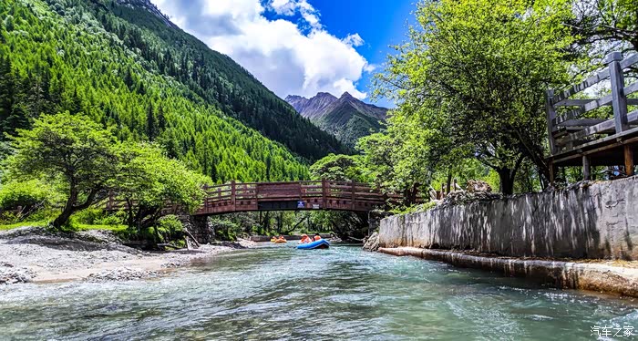不选择漂流,也建议这一段步行,1.8公里的栈道,很漂亮,但是和四姑拉措和人参果坪的景色有些重复。整个双桥沟的游览就此结束了,双桥沟是四姑娘山三个景区里最漂亮的,如果时间有限,那么无论如何都要来游览双桥沟。