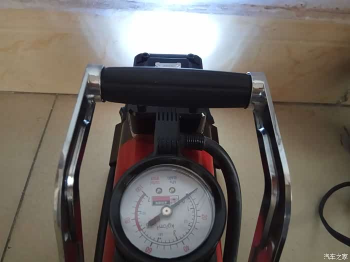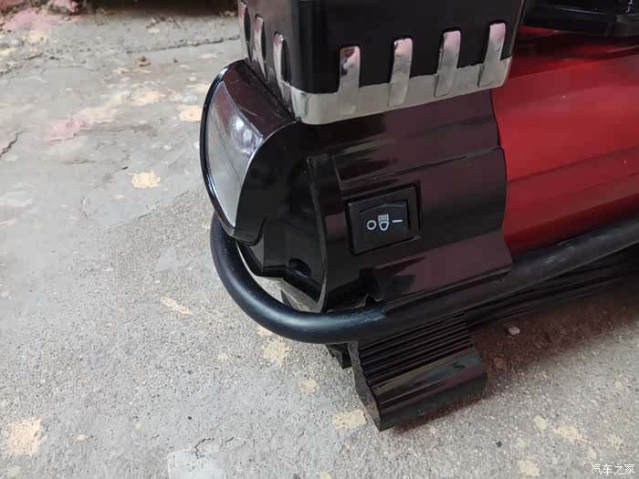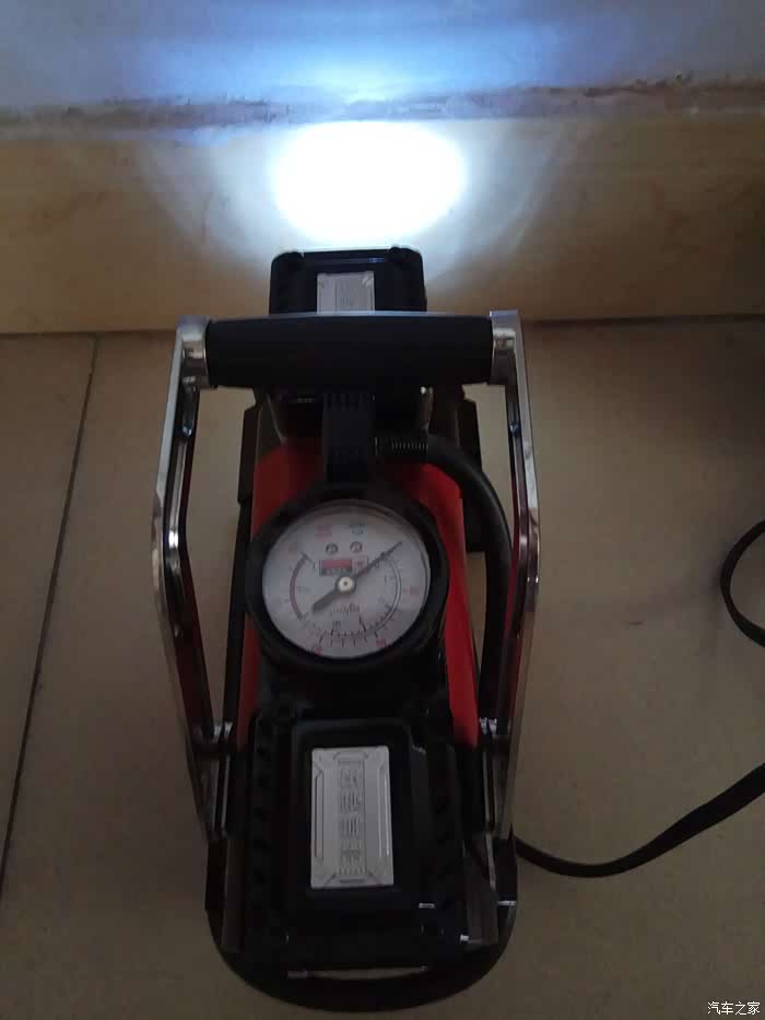 7、产品配有LED灯和开关,如果遇到夜晚胎压不足,而且有需要开车外出,用它给轮胎充气也很方便。