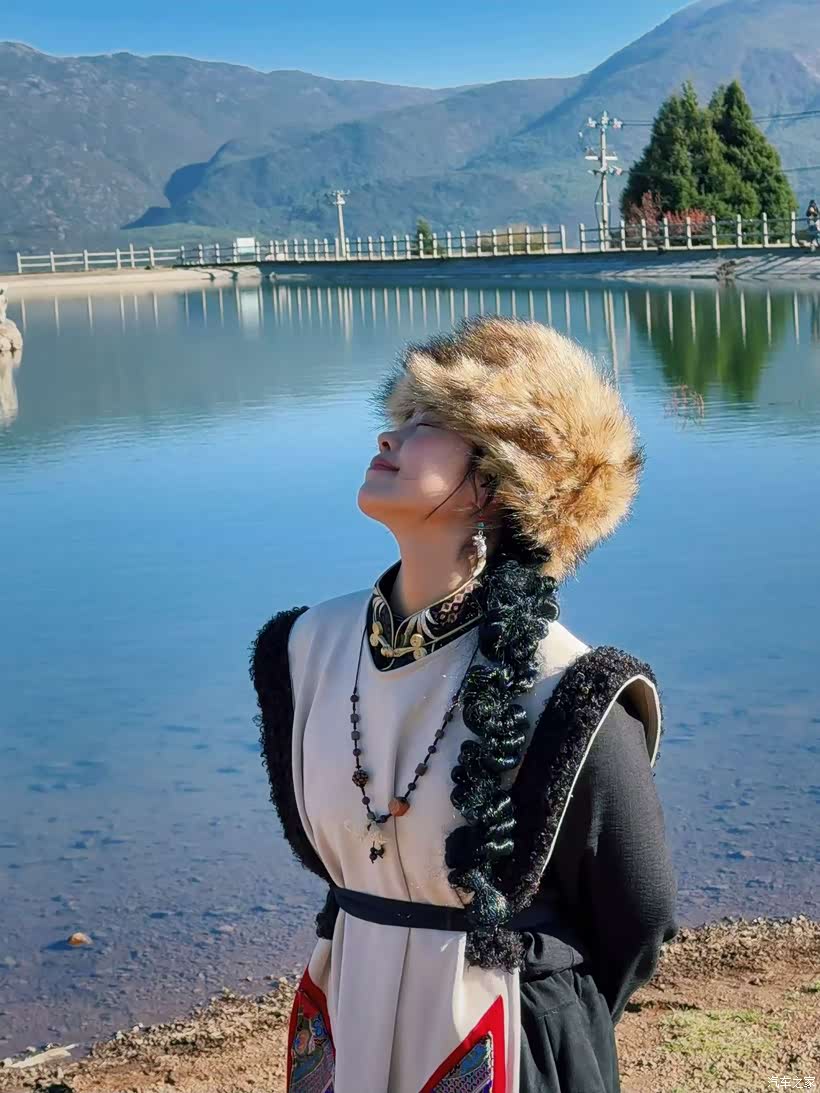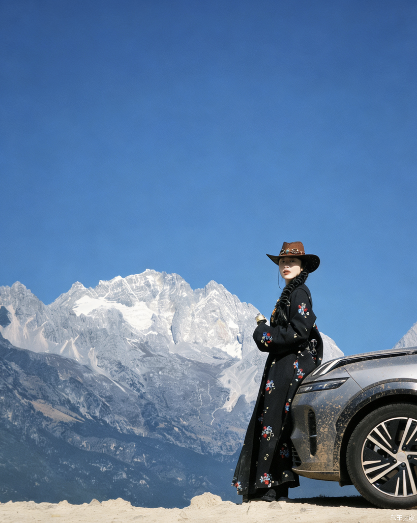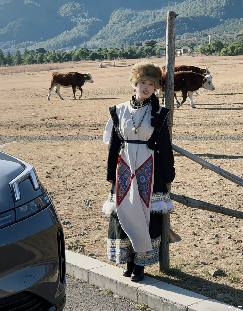 后来又开着车往雪山深处走,路过一片草原,牛群慢悠悠地在草地上走,我索性停车下去拍拍照。换上当地的民族服饰,站在08旁边,车的硬朗线条和雪山、草原的柔美景致撞在一起,拍出来的照片张张都像大片,朋友都笑说我的领克08成了最佳道具。