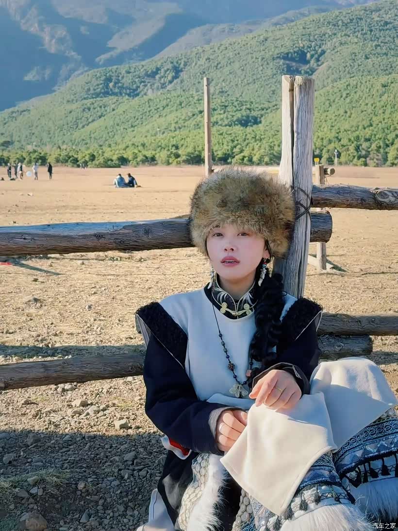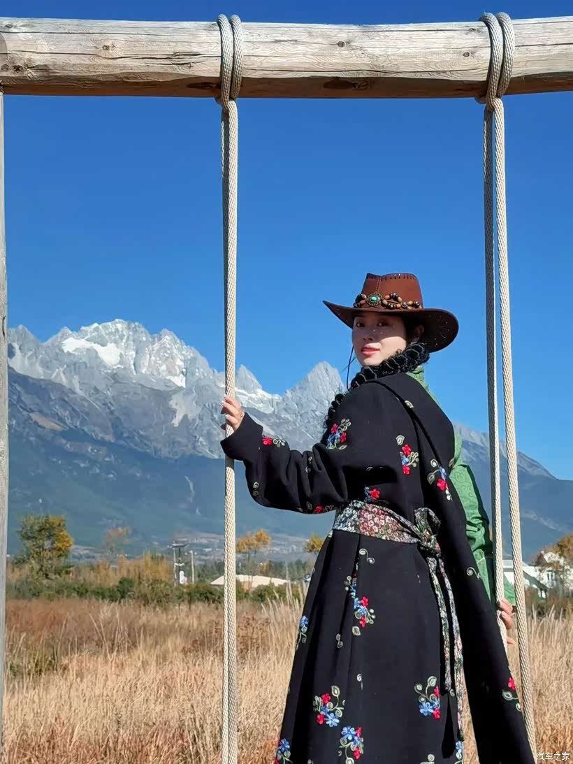 转眼就到了第二天,又换上了民族服饰,坐在雪山下的木秋千上,手抓着粗麻绳,一扭头就是玉龙雪山的尖峰戳着湛蓝的天。身上裹着绣满花的藏装,戴着棕色的牛仔帽,风一吹,藏装的衣角飘起来,和远处的枯草晃成一片。雪山的白亮得晃眼,可太阳晒在身上暖乎乎的,就这么坐在秋千上晃悠,连时间都好像慢下来了,只想盯着雪山多看一会儿。
