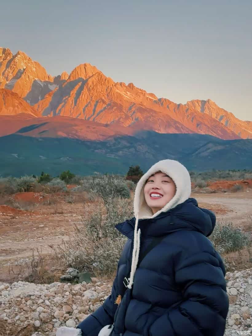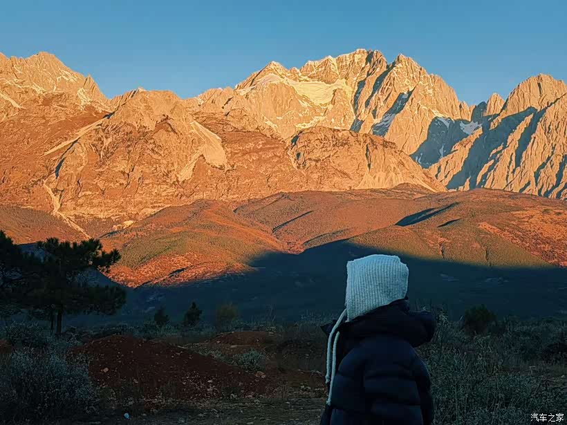 当第一缕阳光落在雪山顶上,白色的雪瞬间变成了金红色,整座玉龙雪山像被点燃了一样,美得让人说不出话。我赶紧推开车门跑出去,欣赏这绝色美景!