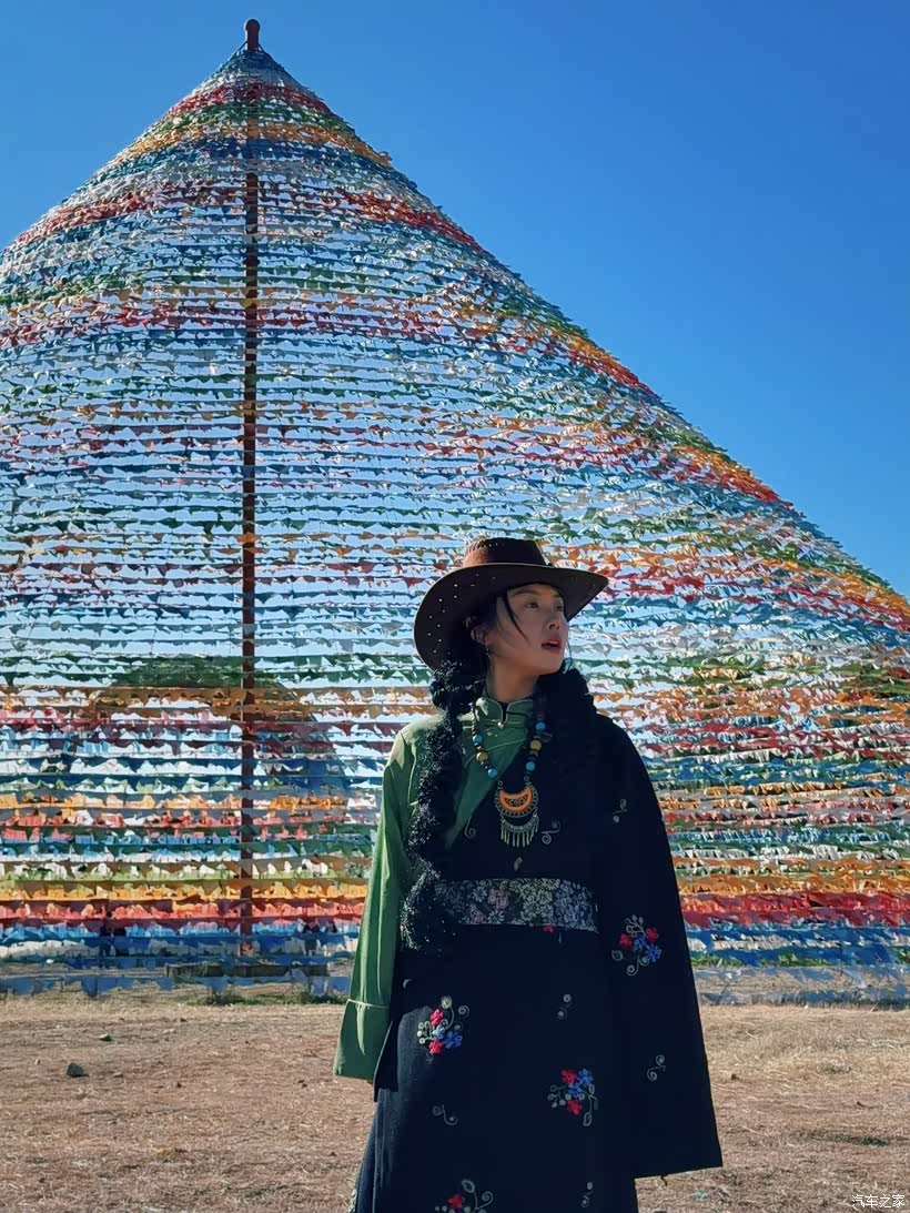 走到五彩经幡堆成的金字塔前,瞬间被满眼的色彩裹住了。经幡在风里哗啦啦地响,蓝的、红的、黄的布条拍在胳膊上,带着点高原的凉意。站在经幡旁边,抬头看这层层叠叠的色彩往天上铺,背后是透蓝的天,身上的藏装和经幡的颜色凑在一起,莫名的搭。伸手摸了摸飘过来的经幡,好像连风里都带着点不一样的温柔劲儿。