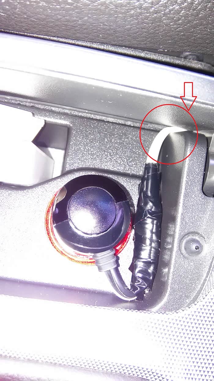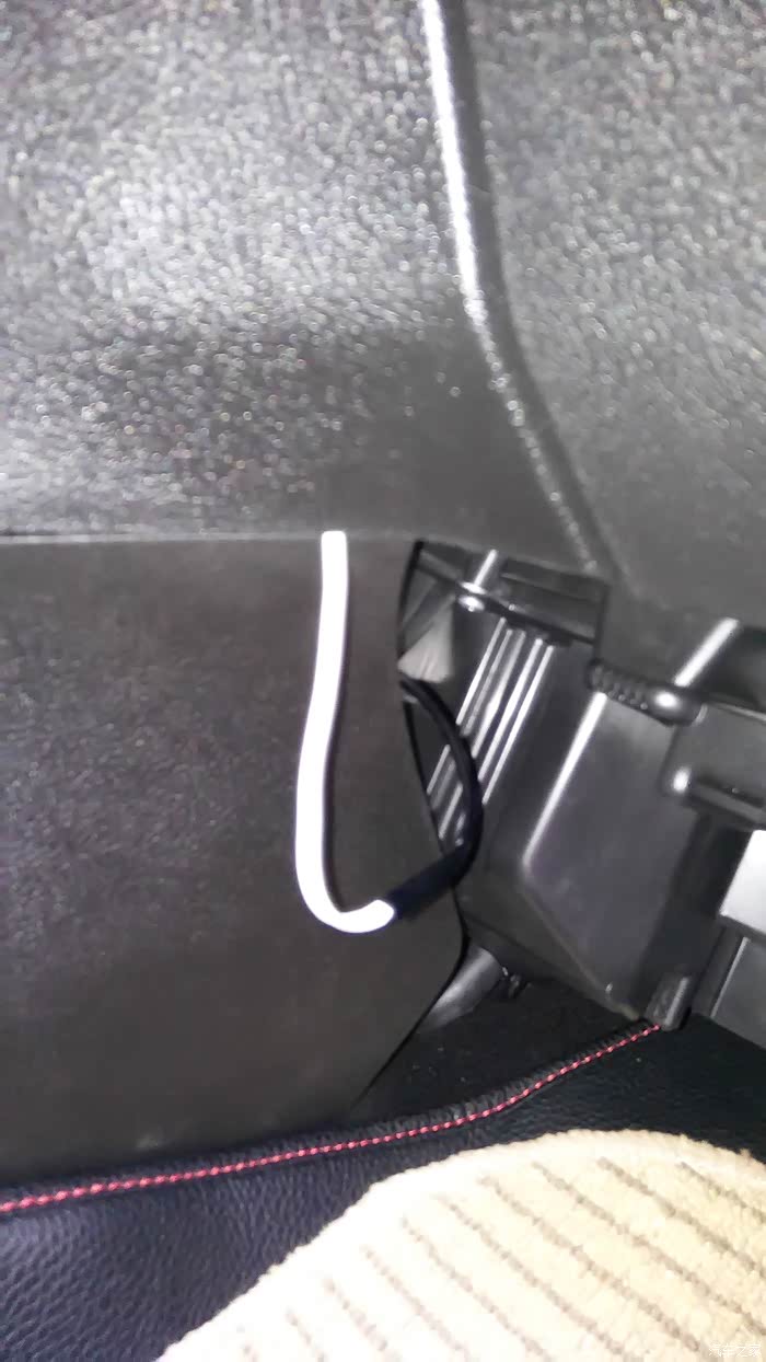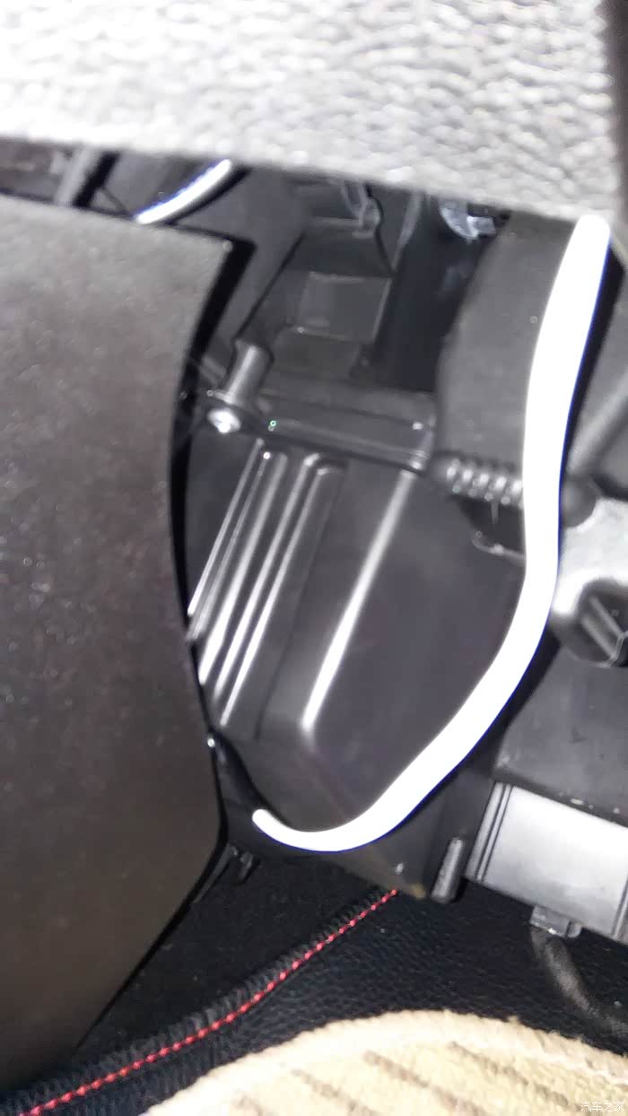 4、 然后我们再把这段电线提到手套箱上面来,最后把这段电线接上我们刚才的另一端就大功告成了(注意:接的时候要留意,一定要跟刚才点烟头的线对其,因为是两条线,一条是黑线,一条是黑白相间的,别接反了。。)