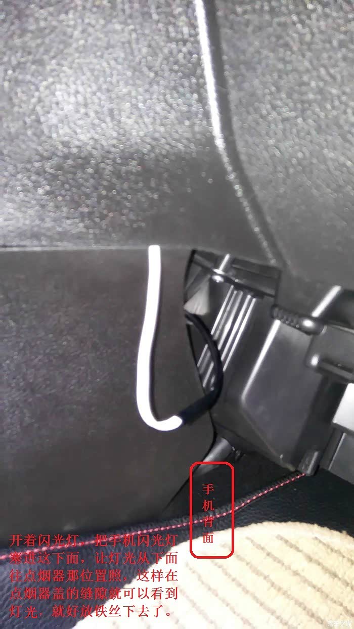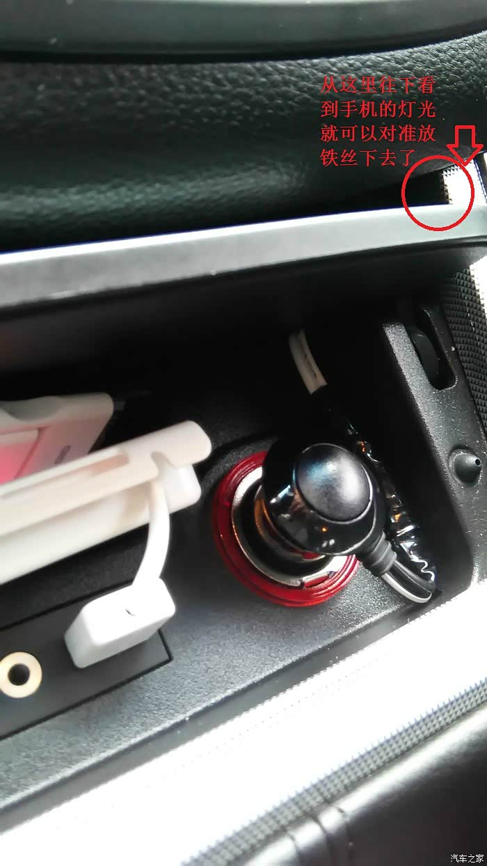 3、 把上面买的一拖四点烟器的点烟头先剪断(这款点烟器缺点就是线太短了,但没办法,谁让就这款点烟头够“短”呢),另外接一段电线,然后把电线往盖子的右上角的缝隙塞下去(提示:不用拆车上的任何部位,但是要在角落的地方看好缝隙塞下去,也可以先拿根软细铁丝先放下去,然后在副驾驶左边的脚下,伸手进去摸到铁丝,然后把点烟器的电线绑一下,在副驾驶的左边脚下拉铁丝,那么点烟器的电线就可以顺着铁丝拉出来了)