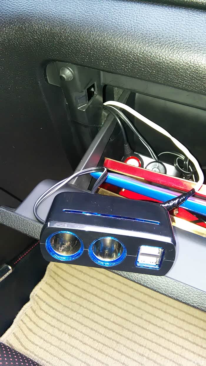 (为避免广告嫌疑,有需要的可以在某宝上搜索关键词“汽车点烟器电源分接器一拖二USB车载手机充电器多功能通用型车充”,就搜得到了,搜出后选最便宜的那家。。标价18块的。。然后选5.5毫米的那个。。我买的时候是38块,有点小贵。。)