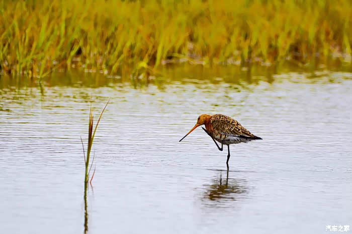 麋鹿出没的小丘陵附近有一个温泉小湖,之所以我们称其为温泉湖是因为在湖水的上方有一层淡淡的薄雾,心想应该是水温比气温高一些的缘故吧。可能也是因为湖水温暖一些的缘故吧,湖中有一些禽类栖息。照片就是一只湖里小憩的水鸟,我们轻盈的脚步并不打扰它的甜梦。
