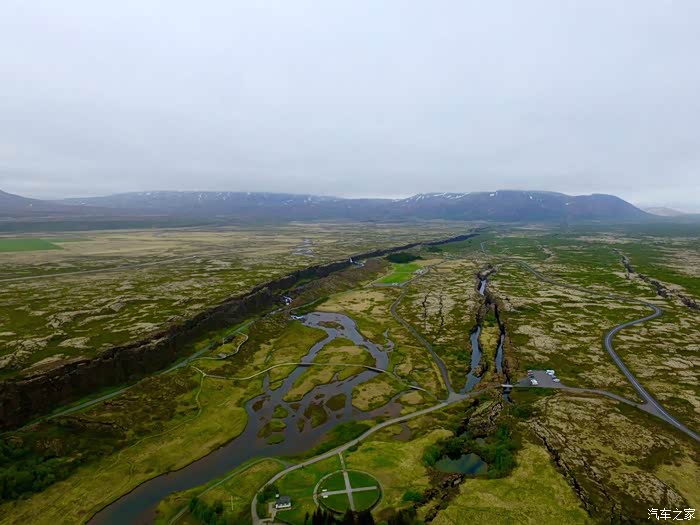 来用航拍的视角眺望一下这道地球上最美丽的疤痕。从这个角度可以清晰的看出一条长长的断裂带一直延伸至远方,这正是两大板块的交界确切位置,地势较高的为美洲板块,地势较低的为欧洲板块。
