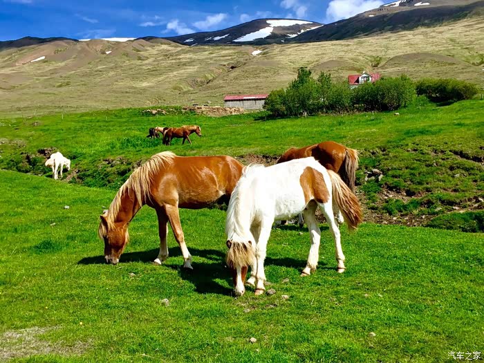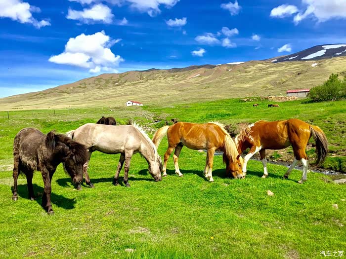 因为冰岛马的地理性隔离,几乎没有传染病。国家为了保持这种状态,冰岛规定禁止一切种畜进口,甚至是一切相关的农用器械。蓝天、白云、雪山、草原……还有冰岛马,感觉此景犹如油画一般美丽!