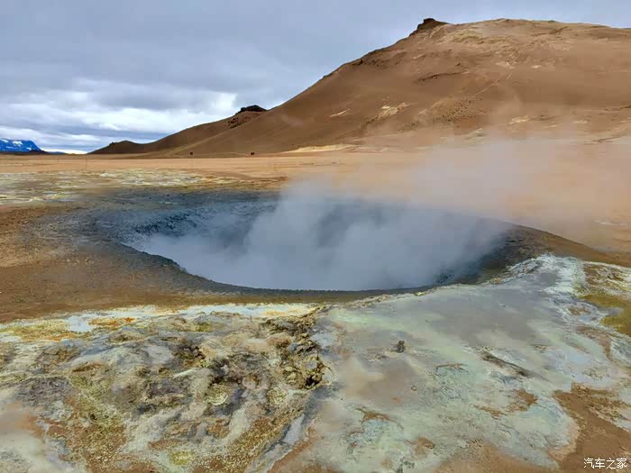 克拉布拉krafla火山至今看上去依然比较活跃,紧邻着主火山口湖的一个小火山湖是个温泉湖,而且地壳也被硫磺染黄了,据说岩浆就在地面之下3000~7000米深处。
