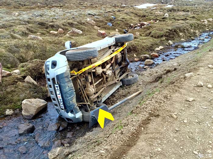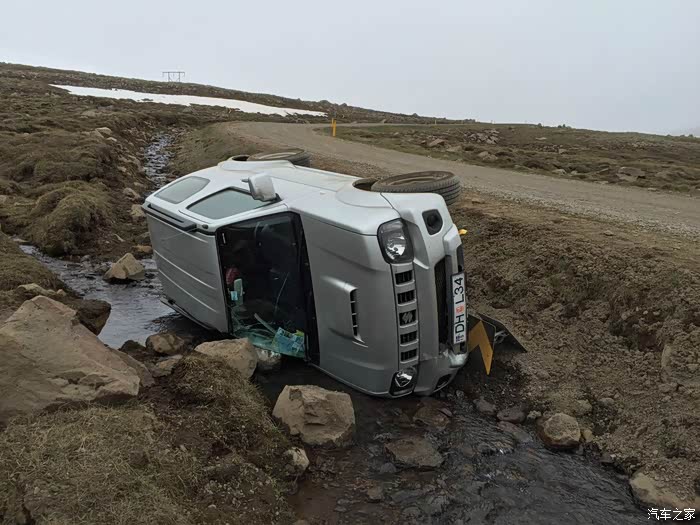 车祸不知已经发生多久了,我们还有一位开沃尔沃的人下车准备帮忙,但发现车里早已没人,在这行路艰难的山顶上,想把它弄下去也是难之又难的。后来我们在埃伊尔斯塔基的加油站加油时又遇到了那个开沃尔沃的热心人,但不幸的是我们发现他车胎已经没气了正在找救援,估计是在山上坏路被锋利的碎石硌到了。