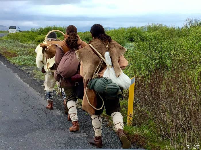 第十天,是我们游览的最后一天,今天的游览区域是冰岛最有名的黄金圈!因为是热门旅游景点,一路上的车也比此前见到的多。开着开着,我正昏昏欲睡,老公忽然说:看!爱斯基摩人!我及时抓拍到了这三个“原始人”,不知道是拍电影的演员还是标新立异的背包客,挺有意思的。
