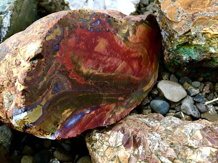 地质构造带上就是容易出产美丽的石头,感觉这块石头像是孔雀石和战国红的合体。