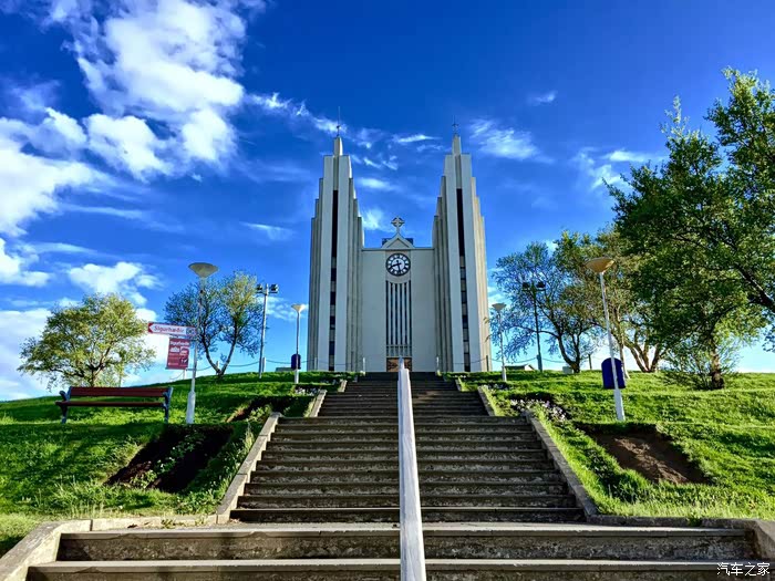 著名的阿克雷里大教堂,这个教堂的设计师和雷克雅未克教堂的设计师是同一个人,所以两所教堂有着类似的风格,节理岩结合管风琴的风格。看教堂上的时钟,现在是冰岛时间晚上八点半。