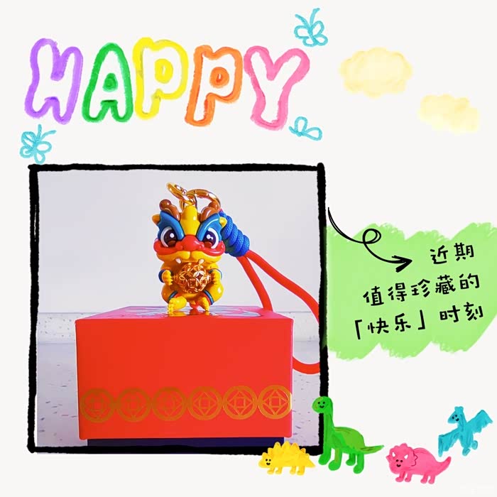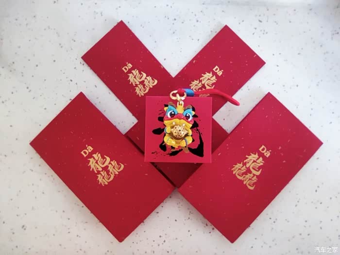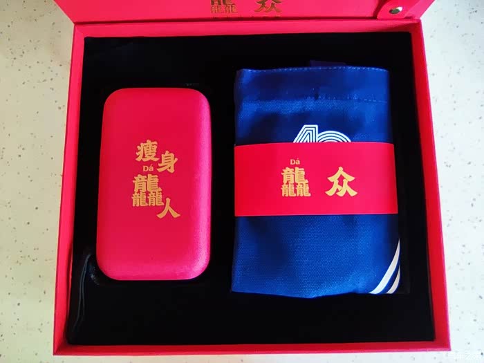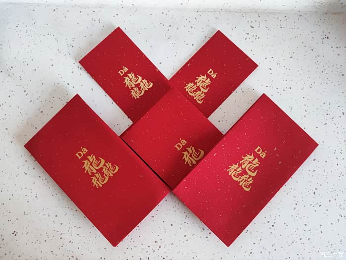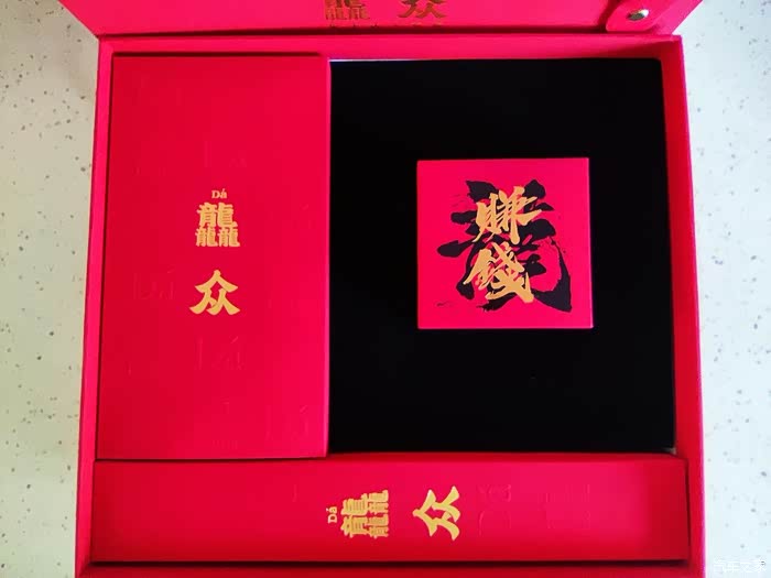 打开皮革封带,取出礼盒。最上层的礼盒,里面有印着“龘”的红包、龘众更出众的对联、福字、还有寓意着“赚钱的”🐲小金龙挂件。