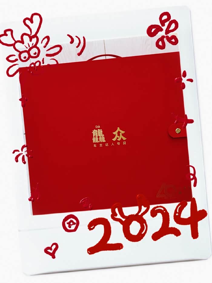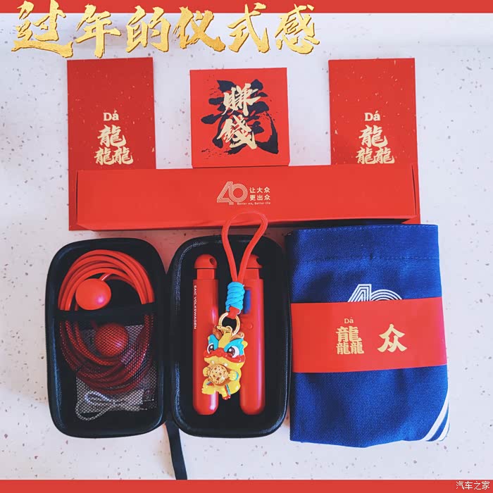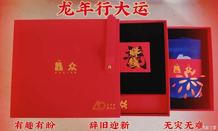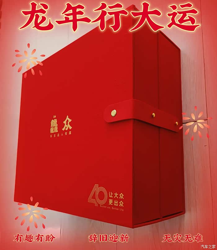 礼盒的正面有暗刻的“龘众、祥云”图案,正中间为烫金大字“龘众、车主达人专属”;右下角印有烫金字“40、让大众更出众”来纪念上汽大众成立的四十周年与对车主的承诺:“让大众更出众💯”。
