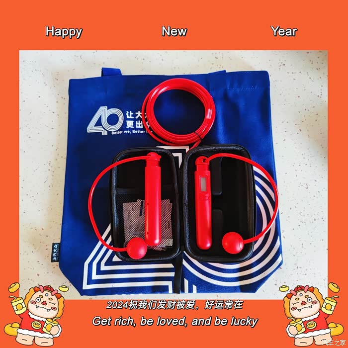 拉开下层礼盒,里面有“瘦身龘人”跳绳 🏌,把过年要健康理念拉满💯,让每一位收到礼盒的车主,都时刻记得过年也需要健康,做一个运动达人🏃;礼盒内还有“龘众”40周年纪念款环保帆布袋,👥让车友明白节能减排、🌲🌳绿色环保从我做起,要做一个有担当的车主🚗。