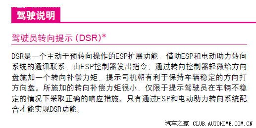 上次在改装PLA时,其中有一项工作是要到转向辅助系统里,进行通道4的“驻车转向辅助”匹配,原来默认设置值是2,要修改成1(提示帮助里说0是关闭功能,1是开启功能),当时发现通道3是DSR转向提示功能的设置,默认值是2,帮助信息说0是关闭,1是开启。今天打开昊锐说明书一看,有以下内容: