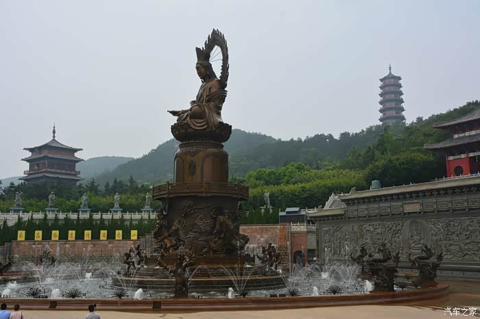 我认为景区内最吸引人的是位于赤山风景区中心的极乐菩萨界。它是以高25.80米、重200余吨的青铜制造滴水观音为主要场景,是集雕塑、音乐喷泉、瀑布、焰火于一体,运用高科技生动演绎古老佛教文化的动态音乐喷泉广场。每天下午2时,在撼人心魄的佛乐声中,莲花下金童玉女缓缓而出,手托金盘承接观音手中净瓶中抛洒的甘露。活动高潮时,周围四束高30米的水柱腾空而起,震撼人心;四大护法金刚口喷焰火,供养菩萨翩翩起舞,池边9条金龙紧跟着行云布雨,喷出水柱,阳光下喷泉水幕折射出美丽七彩霓虹。