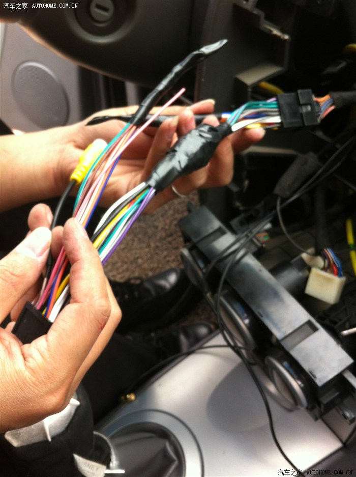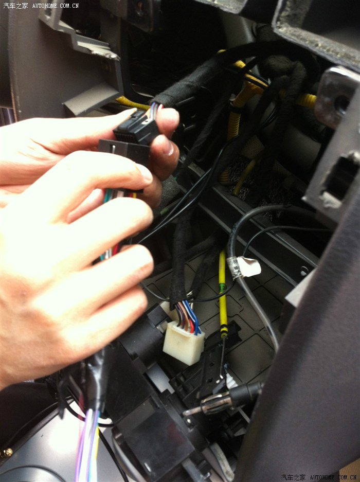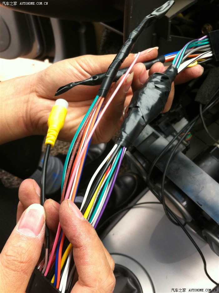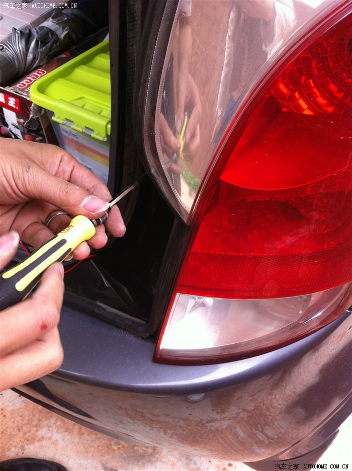 转移阵地,开始埋线,倒车后视装的时候只有我一个人,所以没有拍照,遗憾啊……不过也很简单,网上也有很多其他车子的实例,把延长线顺着前后车门边的密封条卡进去就可以了,前面就从中控台下接到一体机后面的位置,后面就接到保险杠中间的位置。然后用一字螺丝刀把左边的牌照灯撬出来,插头取下,把专用的摄像头线另一端的接头用电工胶布缠在细铁丝上,从牌照灯孔往上面保险杠空隙的位置穿(当然,保险杠的螺丝要取掉,有四颗,要不很难穿过的),拉铁丝,接头当然也就顺着穿过来啦。。。然后把接头街上,注意,现在还有三根细线没有接,一根是视频延长线头子上的红线,接到摄像头位置出来的红线上,然后把它接到倒车灯正极,下面的图就是拆右边的灯,按理说应该拆左边,应该摄像头的位置靠左一些,但是呢,因为我左边接了呼吸灯(也就是网上说的霹雳游侠灯,装了很久了,如果此贴回复有人需要的话,以后再上图吧)的电源线,怕太复杂了出问题,倒车灯的正极是白色的线,我可是试遍了才试到这一根的哦。。。最后,还剩一根黑色的线,我没有接,据说是接地的,我觉得没必要,就用电工胶布把它缠在正极线上固定了,然后把灯装回去。接下来就把摄像头卡进去就完事。。。哦,对了,摄像头总成尺寸要比车上的孔要小一些,需要在摄像头总成外围缠一圈3M胶就可以牢牢的卡进去了。。。至此,后面也算完工了。