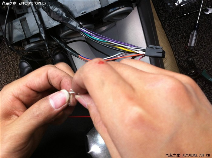 然后机头配的线束里面有一根粉色的,那个倒车检测线,需要接上之前从中控台下面拉上来的视频延长线的红色小线。