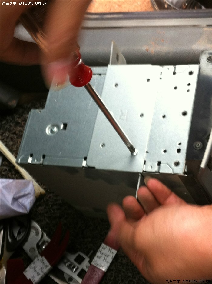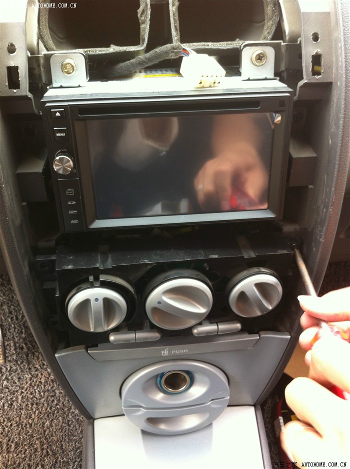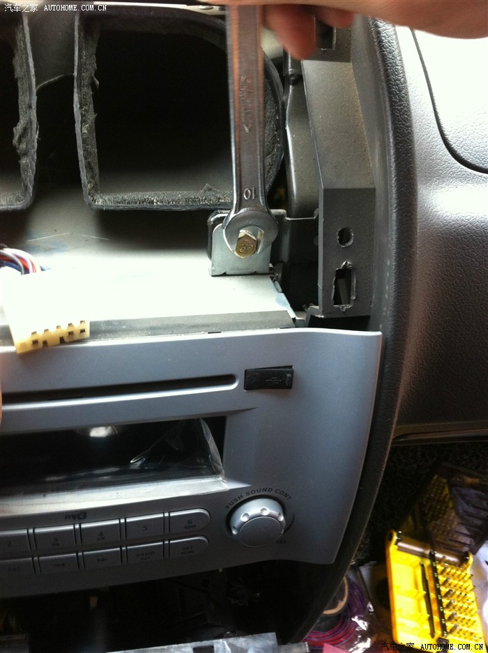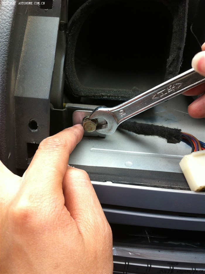 接下来,才轮到我们即将退休的猪脚,哈哈,原车CD机,上下各两颗10MM的六角螺丝,注意准备好对应的套筒扳手哦,特别是下面两颗,因为太靠里面,必须用套筒,我最开始就没用,很费劲的。
