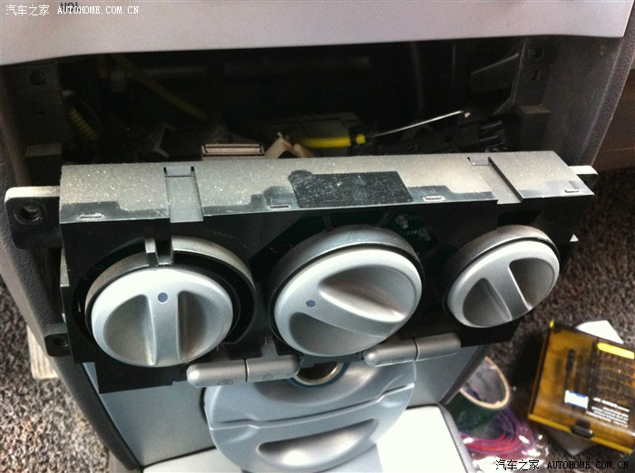 把四颗螺丝起开过后把空调调节开关拉出来,还是要注意,不要太用力,这里面也有很多连接的线,当然,这些接头就不需要取了,免得麻烦