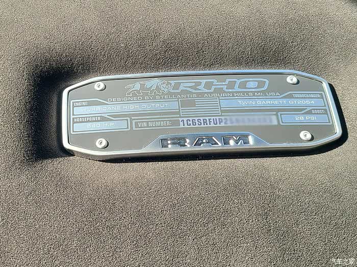 专属铭牌:在中央扶手箱上,有一块巨大的专属金属铭牌。仪式感拉满,上面不仅有 RHO 的 Logo,还会刻上你的 VIN 码(车架号)、发动机型号(Hurricane HO)、以及增压器规格。