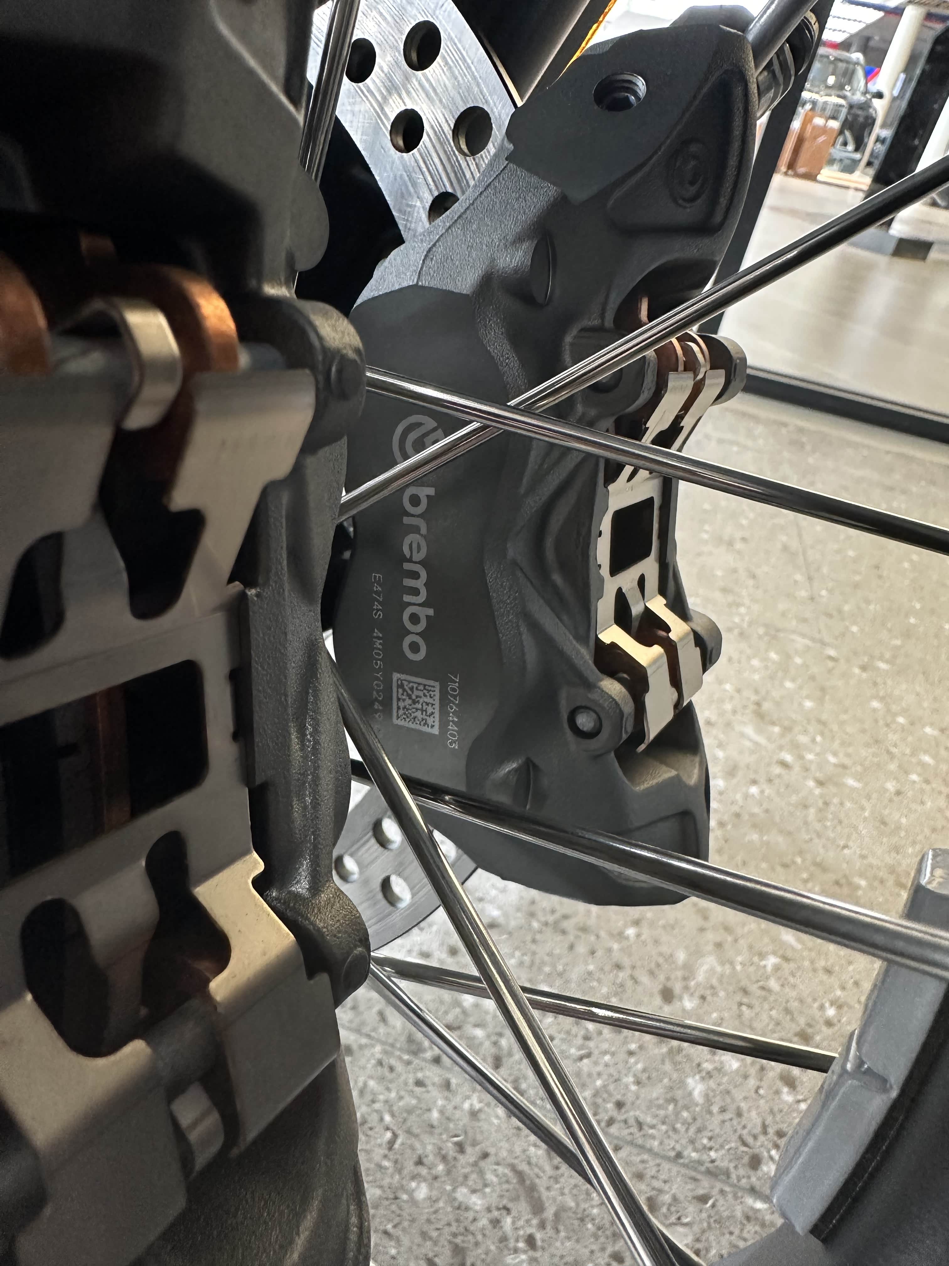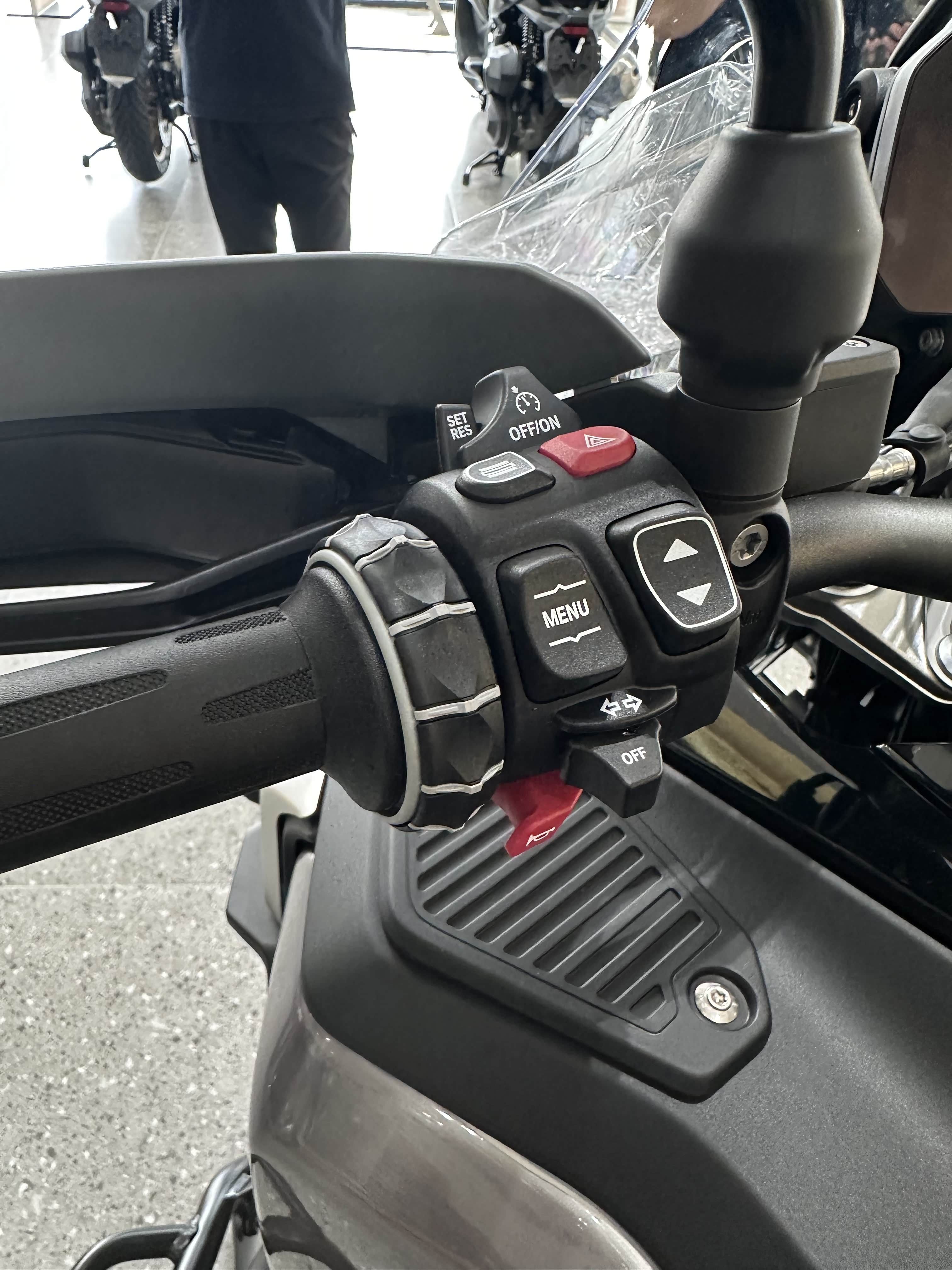 我在店里静态试坐,刚骑上车(上图看看这个车辆在侧撑状态下的角度),打算把车辆扶正,但是第一把直接扶不起来,用力才勉强把车辆扶起来,真是不可思议,1250adv我是很简单就能扶起来的。