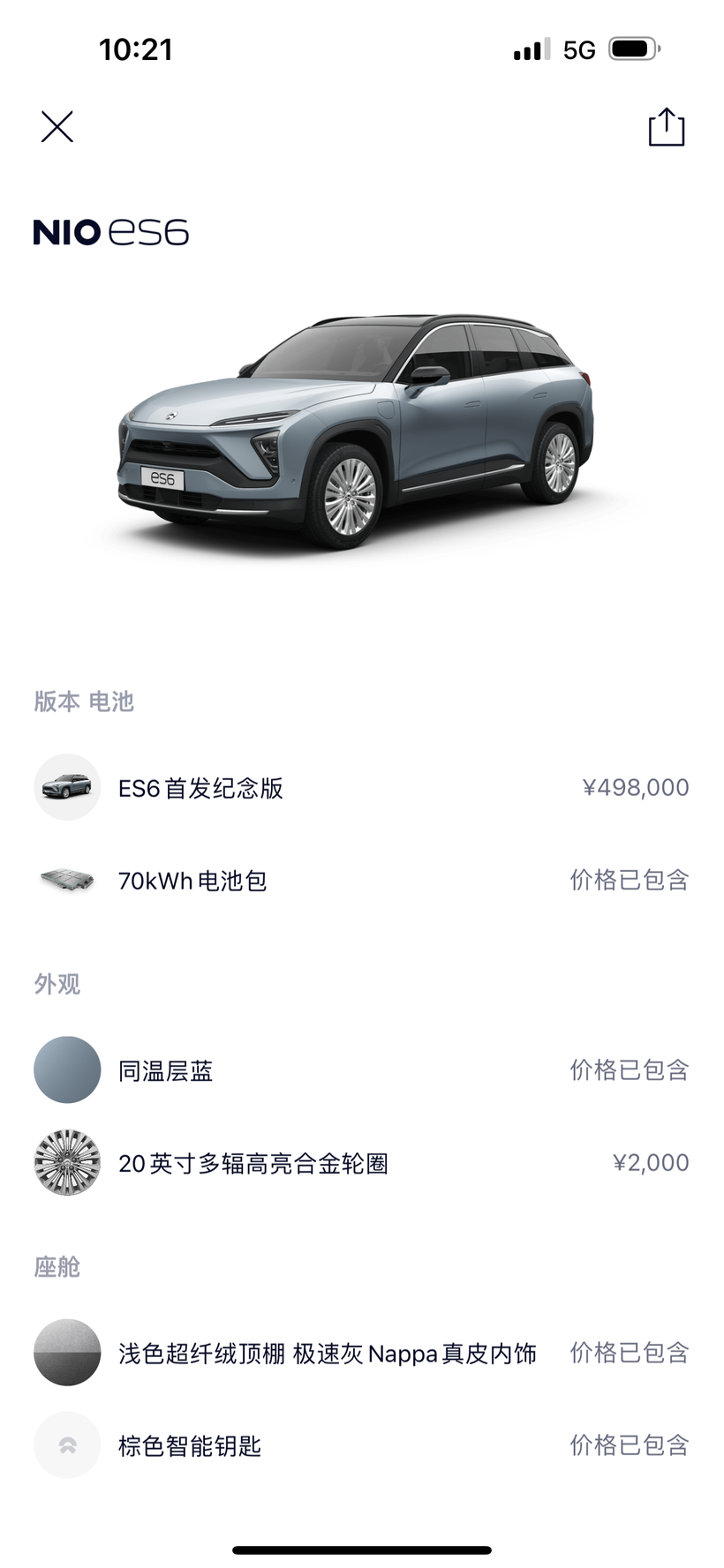 20款蔚来ES6首发版,70度电池买断,同温层蓝+灰色内饰,2020年3月上牌,皖A本地车,10万公里出头,过户1次。车况扎实,保养到位,无大事故。配置拉满:NOMI机器人、抬头显示、Nappa真皮座椅、座椅通风加热按摩、方向盘加热、全景天窗、感应后备厢、自动空调、电动后视镜、无钥匙进入、后排独立空调等。支持自提,看车方便,细节可私聊!